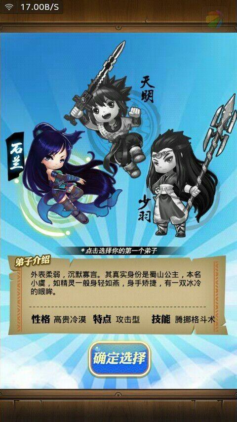 初入游戏,会提供给玩家三个可选人物,分别是天明,少羽和石兰。我个人推荐大家选择少羽。原因有以下几点:第一,少羽属于防御性弟子,放置前排可以承受更多的伤害,拥有一个血厚防高的盾,无疑加大了胜利的可能性,况且前期想要凑齐三个比较不错的盾,除非运气绝佳,否则大多数小R非R玩家是没有这个实力的。第二,少羽属于少数几个拥有群攻技能的弟子,虽说触发率比较低,但是只要触发一次,就能造成大量伤害。第三,在游戏中期,等级提升到16级,系统会奖励少羽的专属武器:霸王破阵枪,而其他两位弟子却没有,“缘”对战力的重要性,想必玩过这款游戏的人都清楚吧。综上所述,少羽的实力要优于其它弟子,选人力推少羽!当然,也可以根据个人喜好。