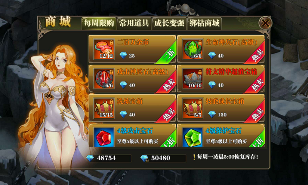 通过商城系统打开,每一个物品都有限购数量,每周一凌晨5点更新一次。想提高战斗力的玩家