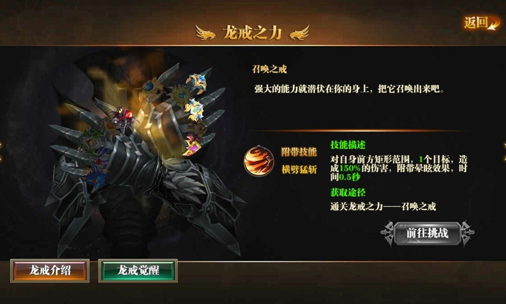 当召唤之戒到达100%时,可以点击召唤之戒进入龙戒之力页面,玩家可以通过龙戒之力来获得