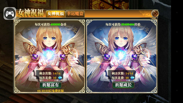分为祈愿富有和祈愿成长,每过一段时间会有一次免费祈愿富有,等不及的玩家可以使用钻石