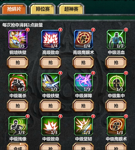 在“抢碎片”中,不同等级的技能书被分割成了不同块数的技能书碎片,收集齐技能书碎片即可合成技能书,而这些技能书碎片往往都有战力同等的其他玩家持有,如果想成功拿到需要的技能书碎片,不要大意向着其他玩家碾压过去吧!同时,抢碎片需要消耗“能量”,能量可自动恢复(类似体力),每30分钟恢复1点。