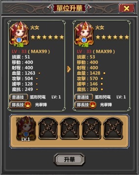 阶级:4星以上的英雄升星前均要经过两次升阶。升到满阶,达到本星级最大等级的英雄,才有机会升星。升阶不会改变英雄等级,并且会大量增加英雄属性。