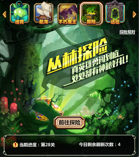 探险: 探险功能玩家30级可开启 。进入后需选定探险队列(有统御和数量双限制),每场战斗都是单路3v3,对手可能是NPC或其他玩家在本模式队列的镜像。战斗默认所有人可以使用队长技,且本场战斗会随机一种特性并显示玩家可使用探险队列中仍存活的英雄布阵出战,每场战斗后记录剩余生命百分比。每场战斗后得到一个宝箱(固定包含培养书、随机包含钻石、战绩、酒杯)