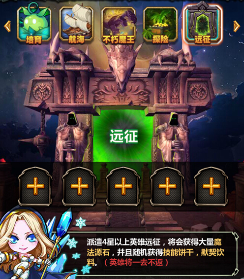 远征: 必须派遣4星以上的英雄才可以进行远征。远征可获得大量魔法源石 ,并且随机获得技能饼干、默契饮料 。值得注意的是,一旦远征,英雄将一去不复返。
