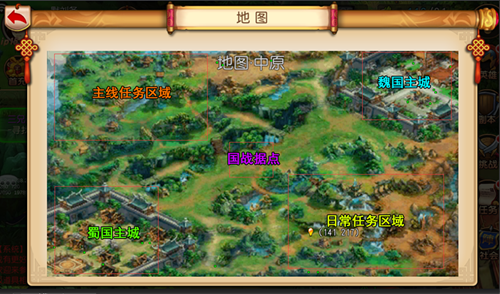 地图整体有点像MOBA类游戏的地图,中间开阔主干道,两侧野外复杂地形区域,让玩家在执行任务、参加活动的时候会经常遇到,并很容易发生冲突,通过小范围的PK拉锯战累计仇恨,定时活动国战仇恨释放,百人同屏史诗国战,国家的归属感更加强烈,谁能叱咤风云?一统三国?