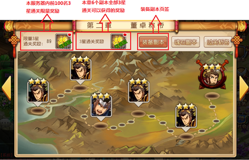 当全部3星通关本章节的时候,可以领取对应的奖励,有小红点提醒,装备副本消耗体力6