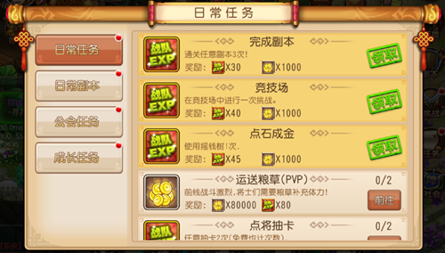 日常任务包括运送粮草、竞技场等每天可完成的简单任务,完成之后可获得战队经验、金币、灵魂石的奖励,每天可在日常任务内领取180点体力。