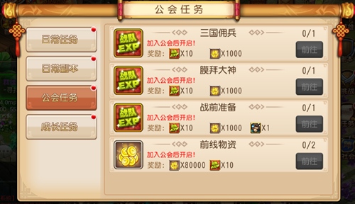 一定等级加入公会之后,会开启公会任务,获得战队经验和金币的奖励。