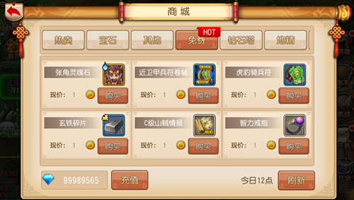 免费商城 所有道具只卖1金币,但是是限量的哦,每天18:00会自动刷新新的道具,千万别忘记购买哦!
