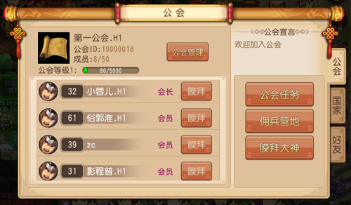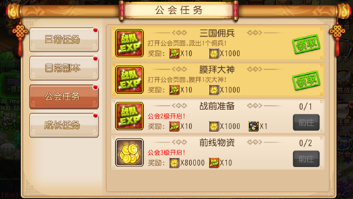 4、公会任务:根据公会等级开启部分任务,等级越高,任务越多。