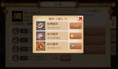 2、膜拜:可膜拜比自己等级高的玩家,每天可膜拜1次,免费膜拜15体力,30000金币膜拜30体力,150钻石膜拜100体力。