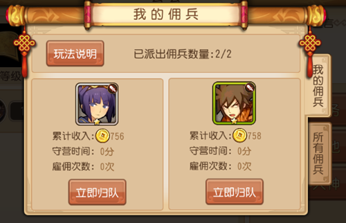 3、佣兵:每次可派出2个佣兵,至少守营30分钟,放入的时间越长,收益越多,公会内的佣兵可支付一定费用,在副本内租用,仅限一次战斗。