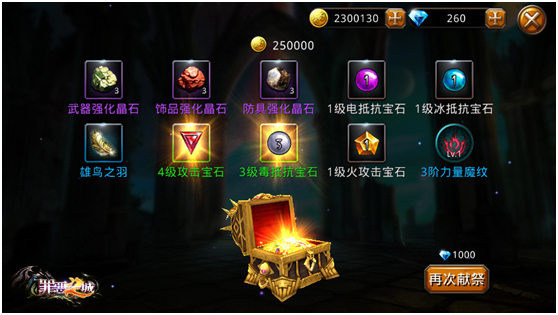 宝石镶嵌和合成我就不多说了,宝石需要大家献祭来获得了,初级献祭10连必出一个2级宝石,中级献祭10连必出一个3级宝石,高级献祭10连必出一个4级宝石。这只是游戏良心给大家的保底,能出几个宝石都看大家的运气,至于是否能出4级以上的宝石我目前还遇到,只能希望了!10连抽献祭我这里有一些小技巧共大家参考: