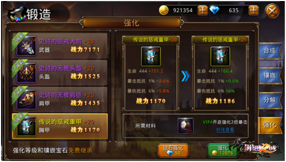 装备强化需要金币和材料,金币有这么多福利活动前期是不用愁的,材料真的是不够啊,这个同样也是可以通过祭献活动,不过随机性太大,我建议还是通过活动副本狙杀五彩龙来获得,还有的就是VIP等级礼包了!装备强化石提升战斗力的重中重,游戏中强化等级换掉装备是可以继承的,这个大家不用怕换装备就要重新强化!