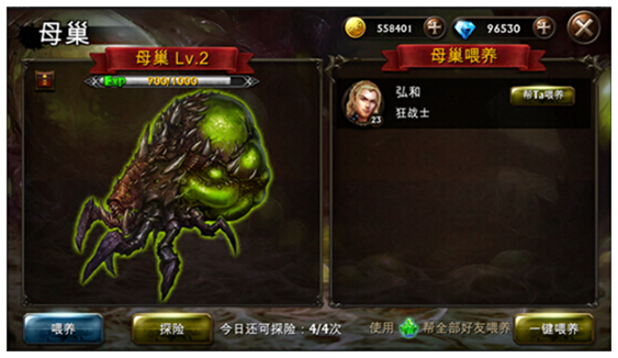 母巣是忠实的伙伴,通过母巣探索秘境,能帮您获得丰厚的奖励,但是每次探险会消耗母巣大量体力,通过喂食母巣,可以快速恢复体力,同时您的好友也可以帮您的母巣喂食。