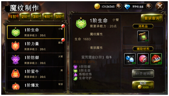 在魔纹构装界面可以制作各种样式的魔纹。获得魔纹后在背包中可以进行装载,从而获得魔纹属性