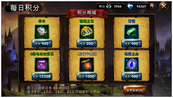 在积分商城中每次随机的商品中不仅有各种材料,也会出现宝石、魔纹图纸等珍贵物品,请随时保持关注吧