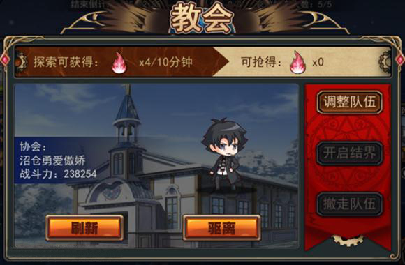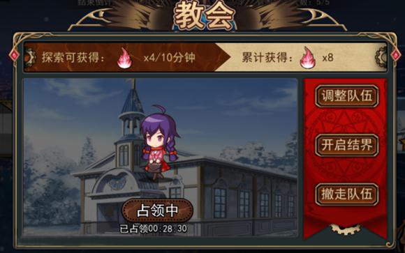特注:每个玩家可以派出2到3个队伍,每个队伍的英雄将被派出到对应场景内挂机,想要在其他场景使用那个英雄,需要先把队伍撤走喔。在每天探索结束,或是离开场景,会收到所获魔晶的邮件用不同颜色的魔尘可以打开不同颜色的宝箱,可以获得金币、训练药水和一个叫做“神圣遗骸的东西”;三个不同颜色的箱子开出道具的概率可是不一样的喔!~~那么“神圣遗骸”是干嘛用的呢?跟着探索遗骸一同开放的,还有【教会】页面的“英灵图鉴”系统