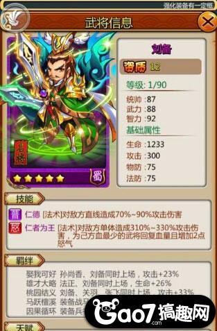 上面就是刘备调整之后的羁绊关系,下面先给大家展示一下+7刘备开满羁绊的属性图,相信应该可以做代表了吧。
