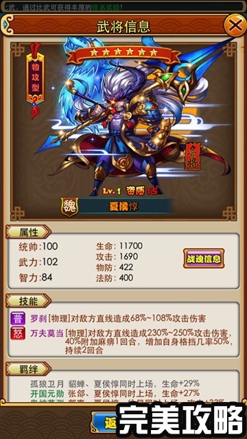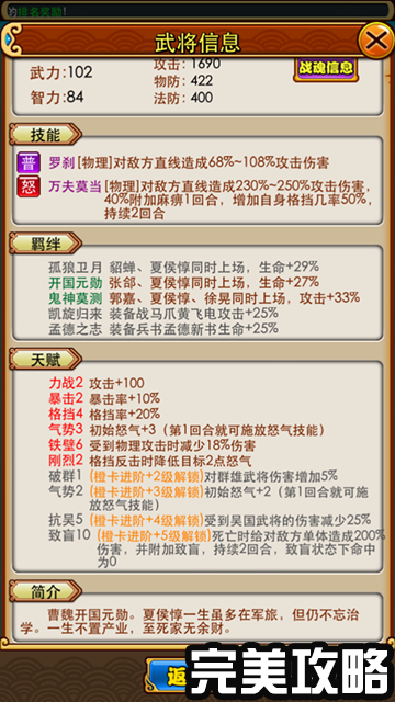统帅100,武力102,智力83。与紫将时期相比(95,97,78),三围各自提升了五点,并且统帅与武力都过百,橙将后的三围是很不错的提升。