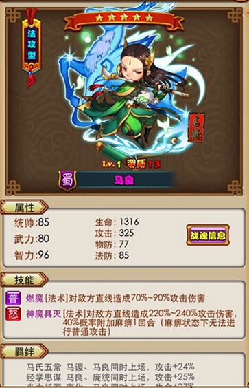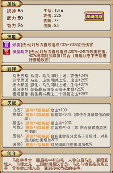 1)马氏五常:与马谡同时上场+24%攻击。马谡为蜀国12资质限时武将,这个要么第一时得到,要么就得看脸了~