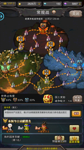 国战活动:原始次数是50点,然后慢慢恢复次数,要善用攻击点最好不要造成浪费,虽然不少但是要想取得胜利更要有些技巧。