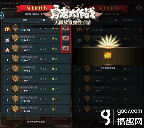 第三个金币彩蛋就躲在骑士团排名中。进入骑士团页面后,只需点击左上角的【骑士团排名】,全服骑士团排名跃然而出。在排名前三的玩家右侧均有一个拇指按钮。只需轻轻点击任意一个拇指按钮,就能获得88万金币,每日都能领取。虽然按钮有三个,但只给一次奖励呦~